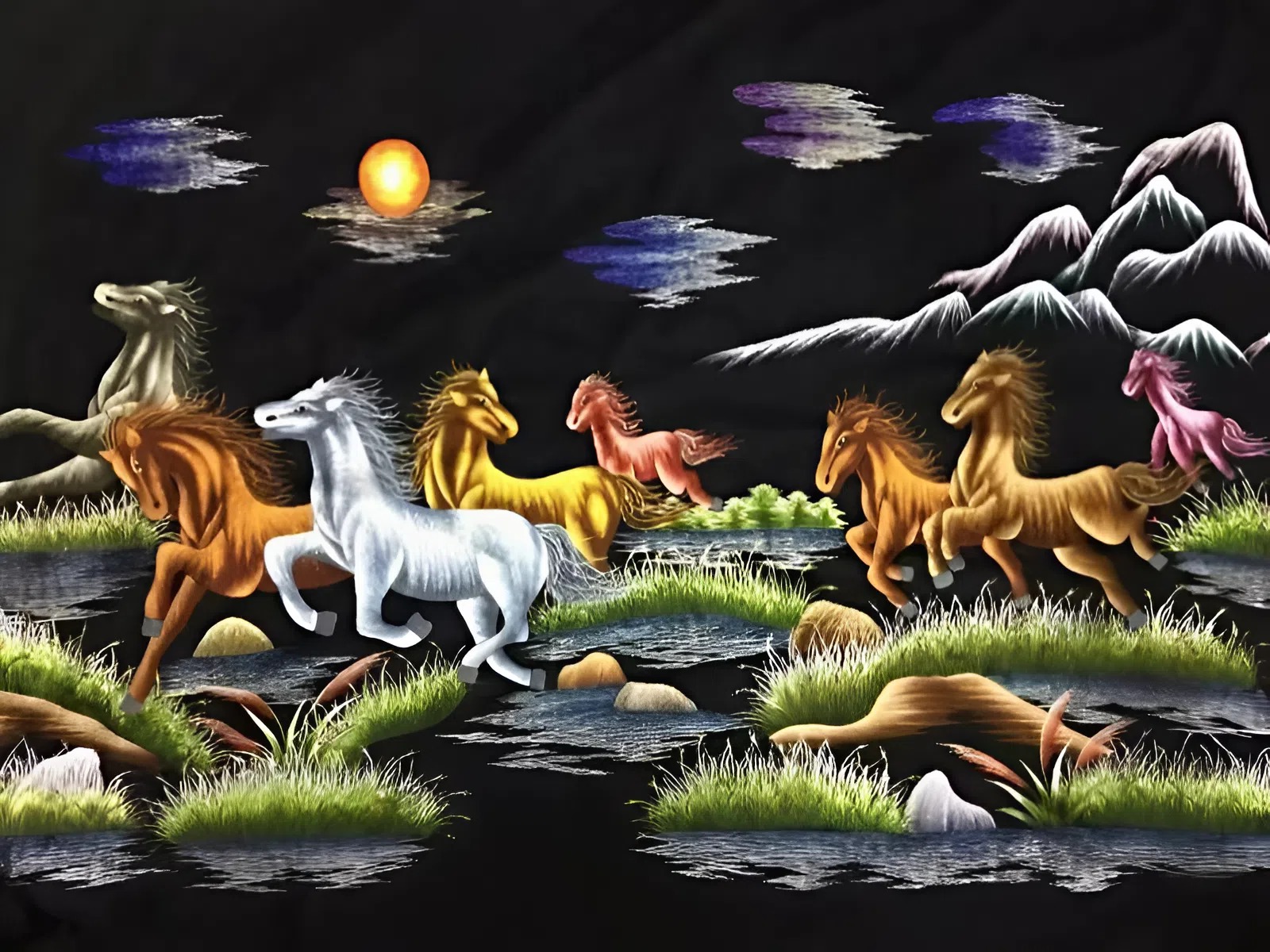 - Người mệnh Hỏa: Đại diện cho năng lượng, sự nhiệt huyết và ý chí mạnh mẽ. Bức tranh thêu ngựa phi nước đại với gam màu đỏ, cam, vàng rực rỡ sẽ giúp gia chủ mệnh Hỏa thêm vững vàng, quyết đoán và gặp nhiều thuận lợi trên con đường công danh.