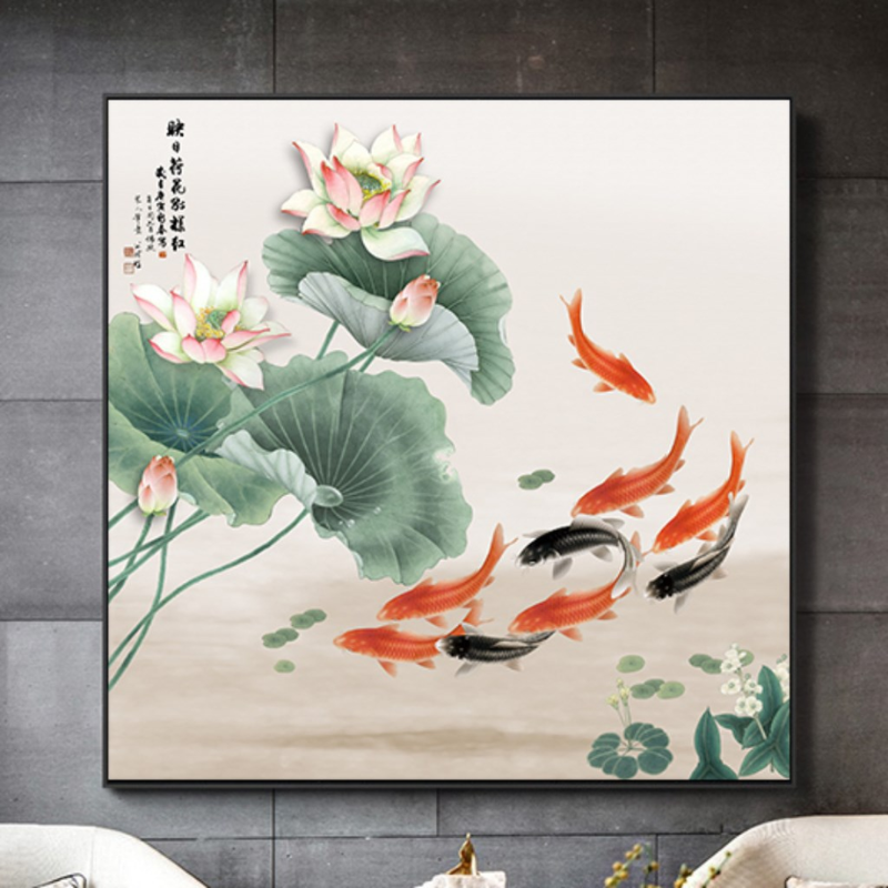 Trong phong thủy, “Liên” (sen) đồng âm với “Liên tục”, thể hiện sự phát triển bền vững, tiền tài nối tiếp không ngừng. Đặc biệt, khi kết hợp hoa sen cùng cá chép hoặc nước, bức tranh còn tượng trưng cho dòng chảy tài lộc hanh thông. Vì vậy, nhiều người chọn treo tranh thủy mặc hoa sen ở phòng khách, phòng làm việc hoặc phòng thờ để chiêu tài và tăng cát khí cho gia đạo.