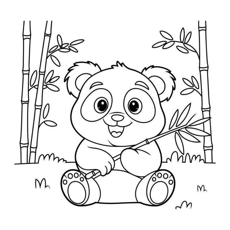 Hình ảnh gấu trúc đang ăn tre là một trong những chủ đề kinh điển và gần gũi nhất. Bé có thể tô màu xanh cho lá tre, màu đen trắng cho thân gấu và thêm nền trời hoặc thảm cỏ tùy thích. Bức tranh này giúp bé nhận biết môi trường sống của gấu trúc và rèn khả năng phối màu tự nhiên, hài hòa.