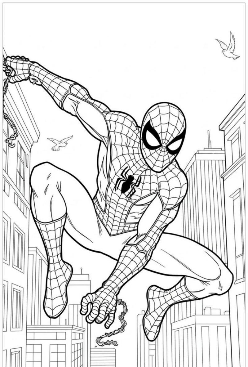 Bé trai đặc biệt yêu thích tranh tô màu Người Nhện vì Spider-Man là hình tượng siêu anh hùng gần gũi, mạnh mẽ nhưng không quá “đáng sợ”. Hình ảnh Người Nhện nhào lộn, phóng tơ, giải cứu người khác kích thích trí tò mò và bản năng muốn “bảo vệ” của trẻ.
