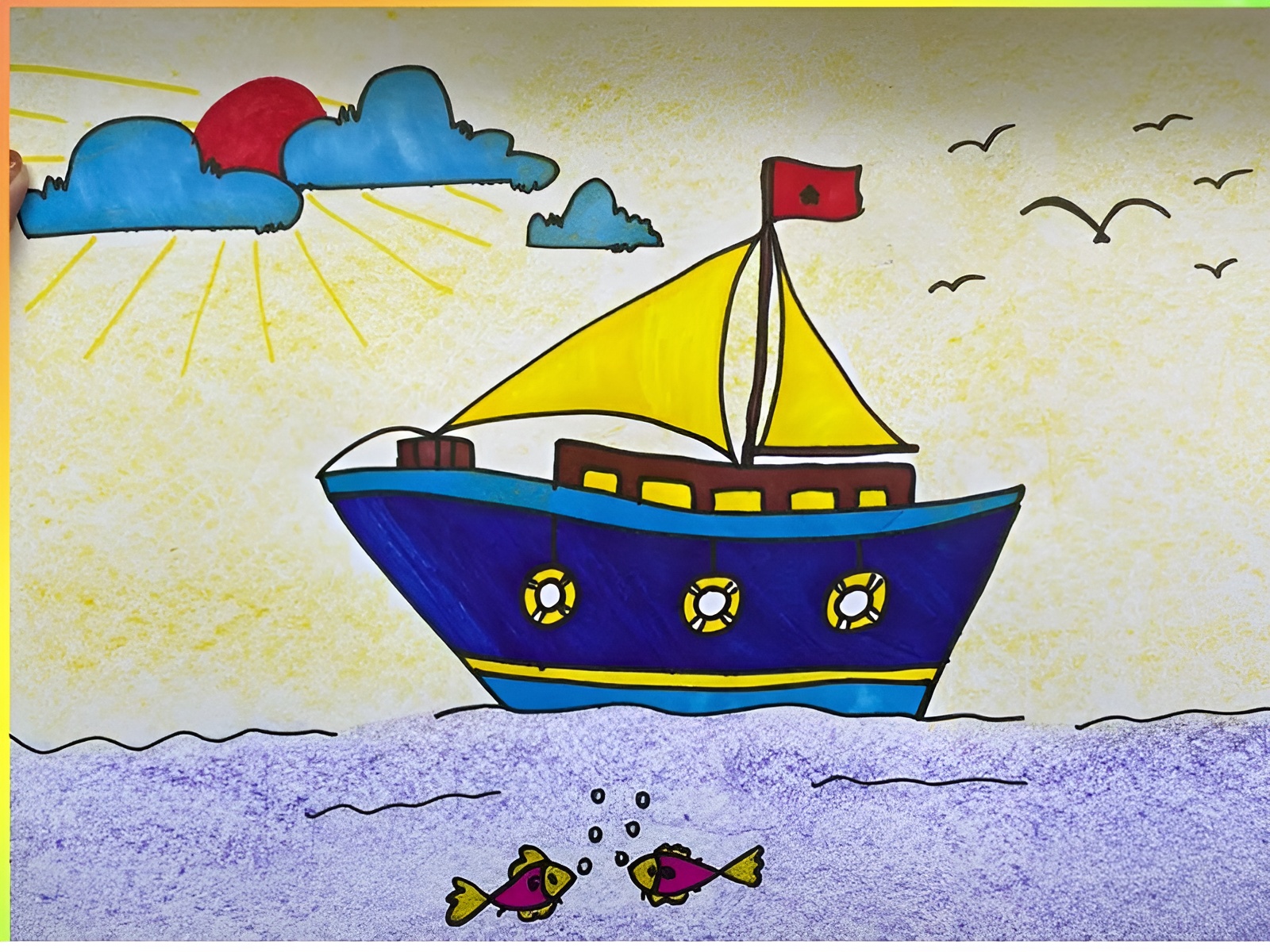 Mẫu tàu thủy có nhiều chi tiết hình khối rõ ràng như thân tàu, cột buồm, mái che, khoang tàu… nên bé dễ nhận diện và tập phối màu hợp lý hơn. Việc kết hợp các tone màu khác nhau cũng giúp trẻ luyện sự tinh tế, sự tập trung và tăng khả năng kiểm soát bút.
