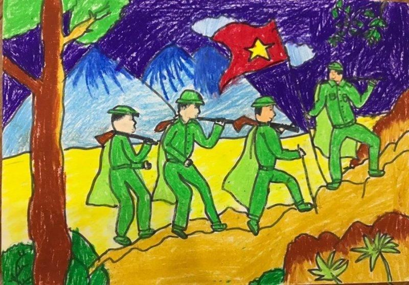 - Đảm bảo điểm nhấn nằm ở trung tâm tranh – ví dụ lá cờ hoặc hình ảnh bộ đội.